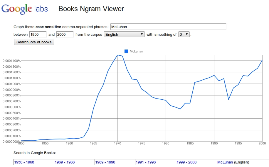 Na década de 1960, o seu pensamento ganhou o mundo, estava nas capas de revistas3 e na televisão4, no olho do furacão informacional que tentava desvendar. Nas décadas seguintes, foi sendo colocado de escanteio, talvez pelo ciúme dos seus colegas, talvez pela sua saúde. No Brasil, foi quando as teorias derivadas do marxismo que condenavam de antemão qualquer tentativa de interpretação dos meios de comunicação de massa que não fosse crítica, o colocaram para escanteio. Uma leitura apressada de sua obra pode até dar a impressão de uma apologia, mas McLuhan, pelo contrário, era até tecnofóbico, encarava a sua missão como uma tentativa de “explorar” o vórtex informacional, buscando uma forma de sobrevivência. Assim, evitando fazer qualquer juízo de valor, observou as consequências do nosso novo ambiente semântico/tecnológico. Muitas das suas “profecias” só começaram a fazer sentido depois da sua morte, com a explosão das redes digitais. É curioso ver como foi crescendo o interesse por sua obra. No gráfico abaixo, usando a ferramenta Books Ngram Viewer5, do Google, podemos ver como as ocorrências do seu nome foram ressurgindo ao longo das décadas.