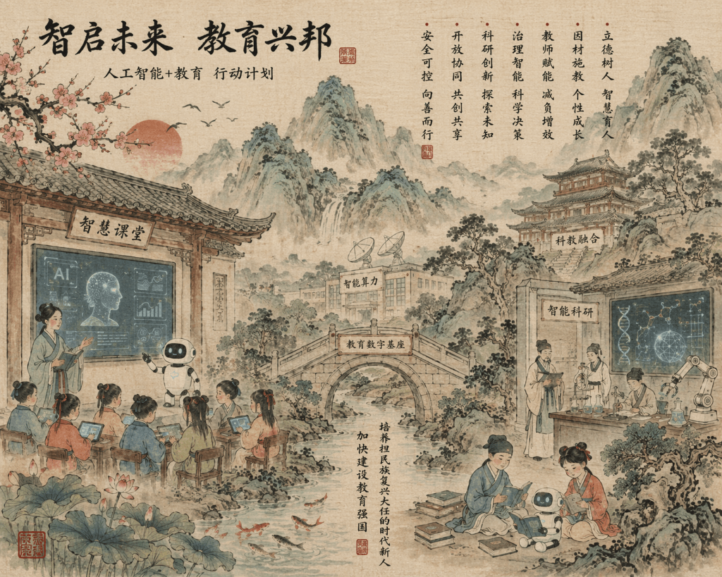 O documento chinês não deve ser lido como uma simples diretriz para uso de ferramentas de IA em sala de aula. Ele é, mais propriamente, um plano de reorganização sistêmica da educação em torno da inteligência artificial. Seu escopo vai da educação básica à formação continuada, passando pela educação superior, profissional, formação docente, governança escolar, pesquisa científica, infraestrutura computacional, padrões de segurança e cooperação internacional. Essa leitura como política total de sistema aparece com força no meu texto anterior, mas é reforçada pela ênfase na abrangência vertical e horizontal do plano (GPT; DeepSeek; Claude).